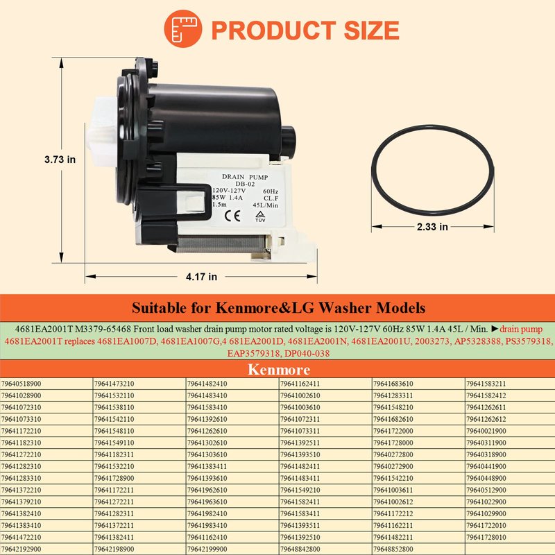 - ใ๐ฃ๐๐๐๐๐๐ ๐๐ก๐๐๐จ๐๐๐ฆใ1 x Lg washer drain pump 4681EA2001T AP5328388 removes water from the washer during the drain portion of the cycle. 4681EA2001T front load washer drain pump motor can make the dryer work more quietly. 4681EA2001T washer drain pump motor can solve the following problems: โ Washer will not drain โกWasher pumps wonโt spin โขNoisy cycles โฃWasher leaks. Youโll just need disconnect the power and water supply. Use a Phillips screwdriver, locking pliers, needle nose pliers, towel, and small flathead screwdriver etc tools. Only takes 30 to 60 minutes to complete on your own, which will save you maintenance costs and labor costs.
