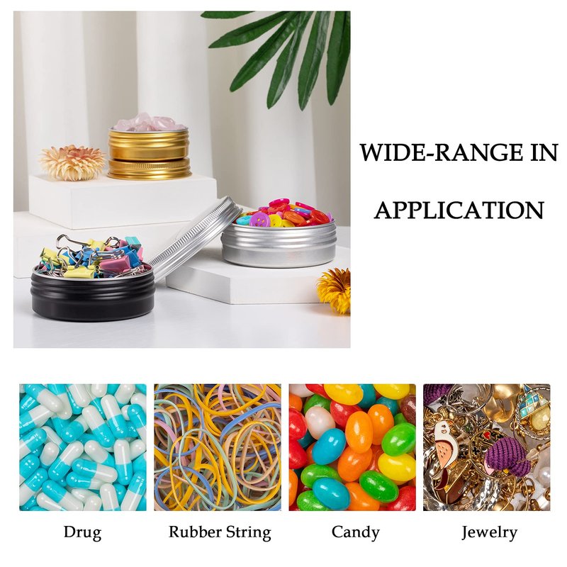 - APPLICATION: Our food-grade aluminum tin containers are dynamic storage jars, ideal choice for storing a wide variety of items like crafts, lip balms, lip gloss, mini candles, cosmetics, sample pots, herbs, handmade lotions