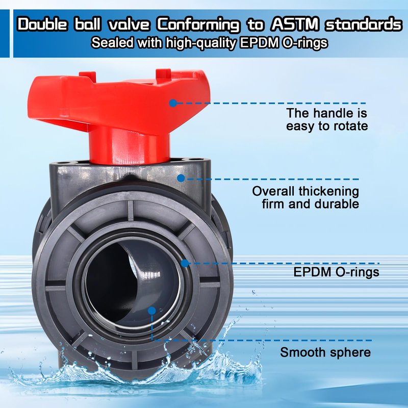 - UPVC MATERIAL: Double ball valve has a PVC body that weighs less than valves made from metals, saving cost and accelerating the project for the easy installation. and it has EPDM O-rings for good resistance to weathering, ozone, UV, electricity, oils, water, steam, and some solvents. The PTFE seat resists chemicals, moisture, and high temperatures.