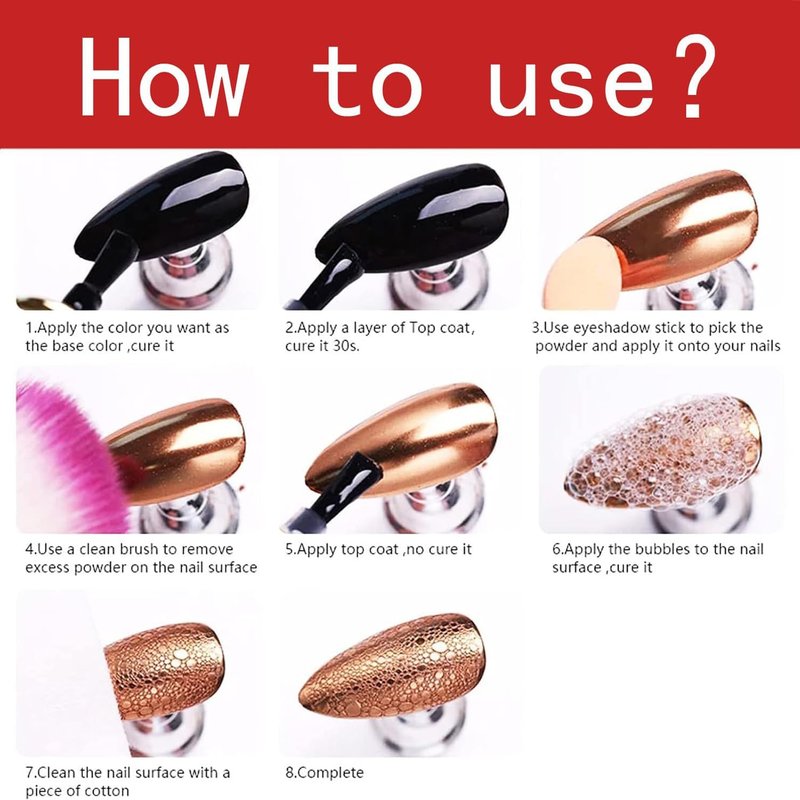 - 【MIRROR EFFECT】Mirror effect will differ from different base color.Black base can create a better mirror nail effect.It is also a good choice to create unique nails.