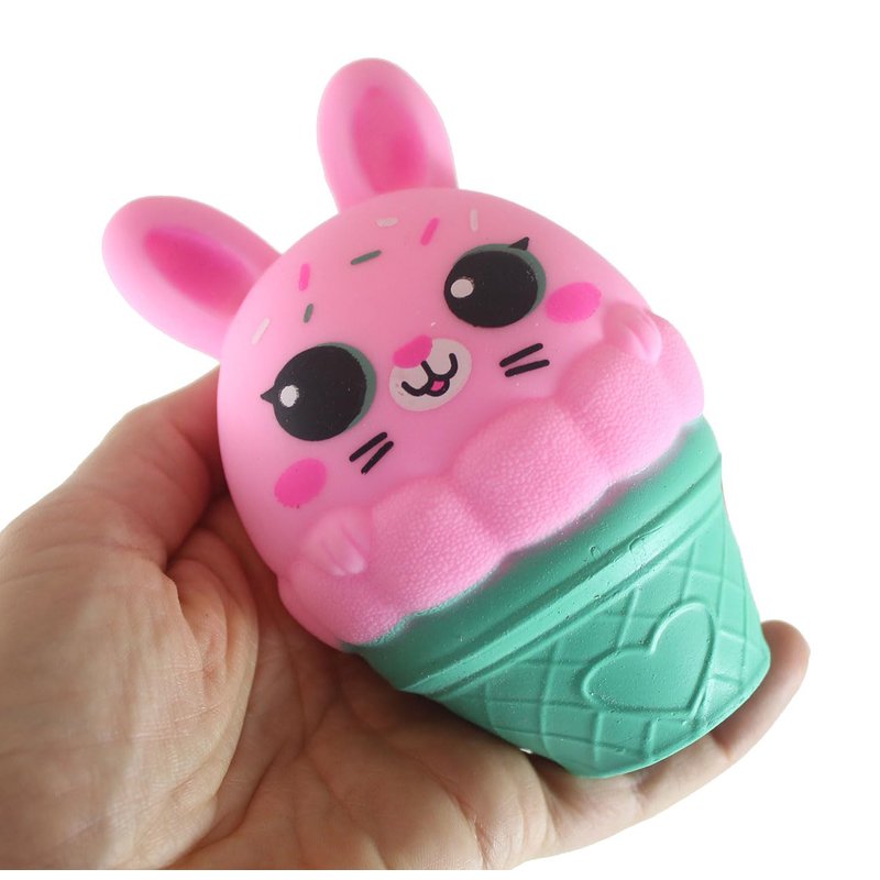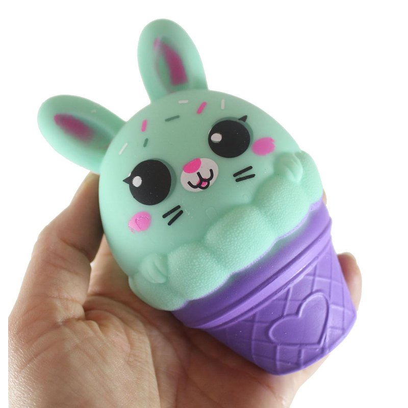 - INCLUDES 1 RANDOM COLOR BUNNY - These adorable bunnies atop an ice cream cone are soothing sensory balls. They are filled with a thick creamy white doh that resembles frosting. These have a very soft and squishy feel, it is very easy to squish. 4.5" tall by 3" wide. They come in 4 soft colors including pink, purple, white, and teal.