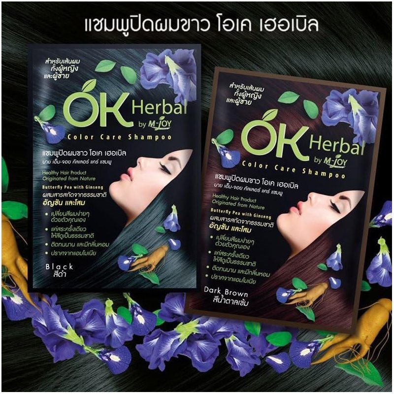 OK Herbal Healthy Hair Product Originated from Nature Butterfly pea with Ginseng 30ml How to use: 1. Wear gloves 2. Squeeze both shampoos on the hands or the container. 3. Mix both shampoos into homogeneous. 4. Bring the shampoo already mixed on dry hair. 5. Crush the foam all over the head. 6. Leave 10 - 15 minutes or more if you want long-lasting color. 7. Wash with clean water Precaution : 1. Contains Hydrogen peroxide, Resorcinol, Phenylenediamines. 2. Read and Follow precaution strictly. 3. Wear suitable gloves for using. 4. Avoid contact with eyes.Rinse off with clean water if contact with eye. 5. Don't apply to eyelashes or eyebrows. 6. This product may cause a serious allergic (Do allergic test before use). 7. Keep product away from the children. Don't apply on children. 8. Don't apply this product if, 8.1 You have redness on face, sensitive scalp or wounded scalp. 8.2 You have a experience a reaction to a hair colorant before or after tattoo with a black henna. Thank you