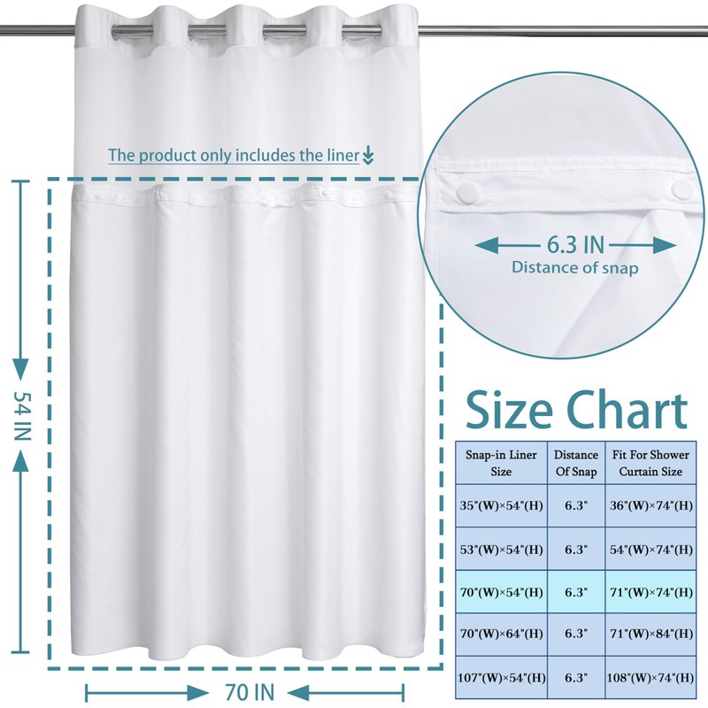 - Snap-in Replacement liner : Snap in liner replacement for hotel fabric shower curtains WITH WINDOWS, we offer three size for choice:70Wx64H (For 71(W)x84(H)Shower Curtain),70Wx54H (For 71(W)x74(H)Shower Curtain),107Wx54H (For 108(W)x74(H)Shower Curtain)
