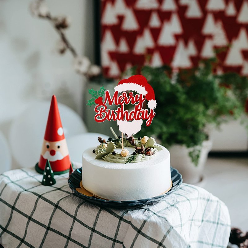 1 PCS Glitter Merry Birthday Cake Topper Assembled Holly Leaves and Berries Santa Claus Beard Cake Pick Decorations for Merry Christmas Theme Baby Shower Kids Birthday Party Supplies Red