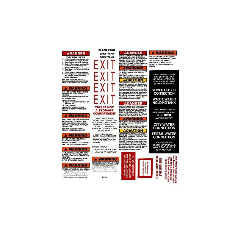 1- RV/Auto/Boat Graphic This sale includes entire decal sheet. Total Sheet Measurements: 13" inches across in length x 14-1/2" inches in height. (Measurement is at the thickest point of the decal.) Colors depicted: Multi 32- Decals Included: 3- Danger/Caution decals 7- Warning decals 3- Tank decals 4- Exit decals 1- Air conditioning circuit decal 1- Storage decal 2- Battery hookup decals 1- Safety switch decal 1- Wheel lug decal 2- Electrical connection decals 6- Water/sewer decals 1- Winterized decal Decals can be applied to any flat non-porous surface. Decals are made from 6 mil Premium Outdoor vinyl and laminated to last at least 7-8 years.