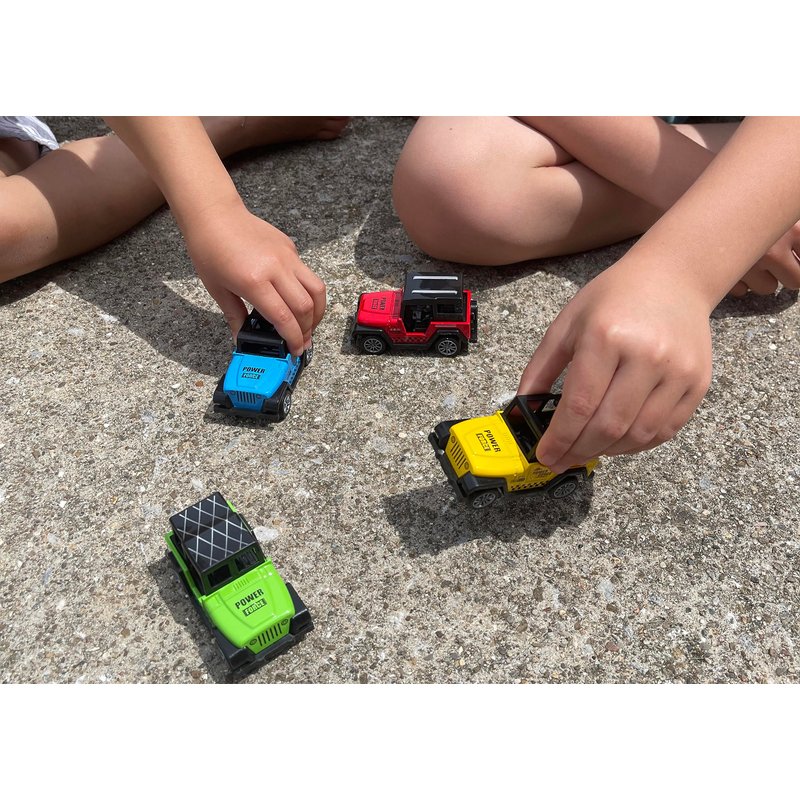 • Comes with 4 different colors of Off-Road vehicles. Pull back and go!