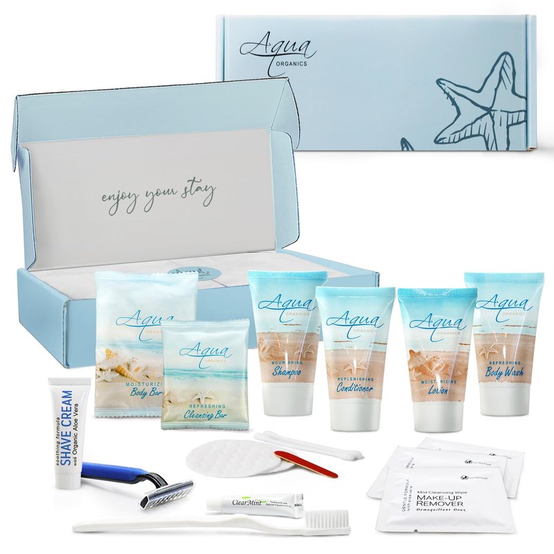 1-Shoppe All-in-Kit|Aqua Organics Amenity & Accessory Kit|1oz Travel Size Shampoo, Conditioner, Lotion, Body Wash,Body Bar, Cleansing Bar, Shave & Dental Sets, Make-Up Remover Wipes & Vanity Kit|1 set