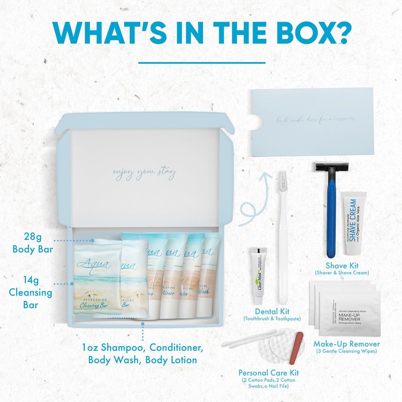 - COMPREHENSIVE 1-BOX CASE: Elevate your guest experience with our Guest Boxes that include 1 of each of the following: shampoo, conditioner, body lotion, body wash, and body bar. Plus, cleansing bar, shave kit, dental kit, make-up remover, and vanity kit.