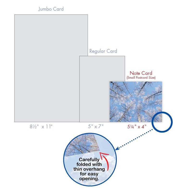 SNOWY BRANCHES GREETING CARDS Go out on a limb and write your loved one a meaningful message. On these 10 blank greeting cards, you can write "tree-mendous" Christmas notes or non-denominational sentiments. Share beautiful holiday messages without the chill of real snow. On these premium-quality note cards, you can write notes that will be cherished long after the winter snow has melted. PREMIUM QUALITY AND DESIGN These cheerful holiday cards are an assorted, bulk stationery note set. This is part of a larger collection that spans a broad range of motifs, from traditional themes to contemporary graphics to vintage art – there's something for everyone! Our cards are printed on-demand on thick, bright, premium recycled paper. Many of the designs are available in both greeted and blank versions. Known for our funny cards and what has been described at times as snarky humor. We proudly print all our products in North America - USA and Canada (of all places)! Every card is printed to-order and on demand, eliminating waste & obsolete inventory. No matter what the product assortment is, we strive for perfection - every card, every order, every time.