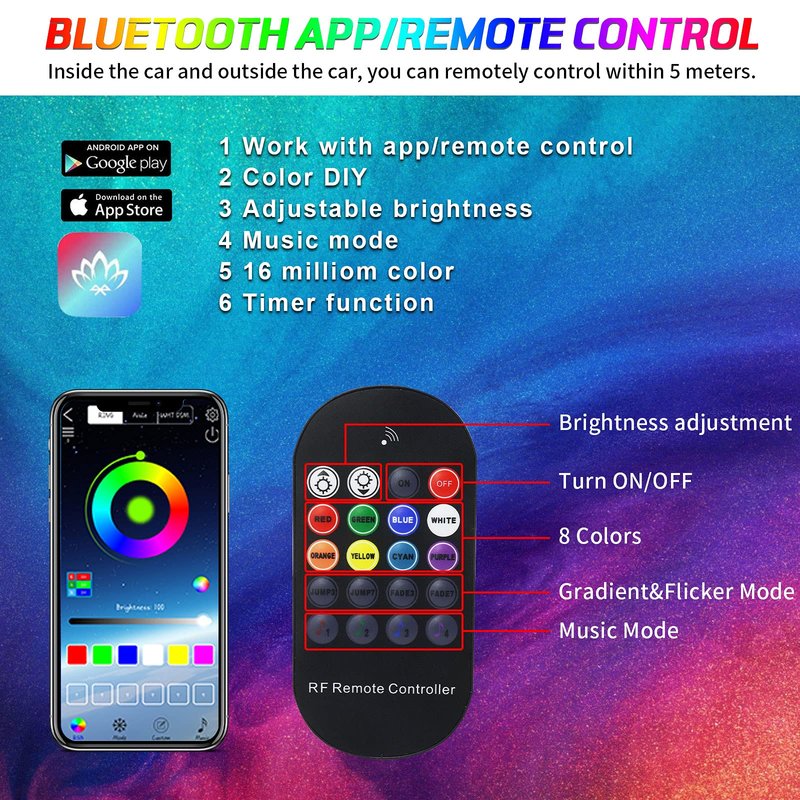 - 【Remote Control + Upgraded APP Control via Bluetooth】 Remote control: 8 static color(red, green, blue, white, orange, yellow, cyan, purple), 3/7 colors jump, 3/7colors fade, 4 music modes and adjustable brightness. Use APP control after Bluetooth connected with the led lights for car: 16 million colors, brightness 1%-100%, DIY color, voice control mode, 20 preset modes, timing function.