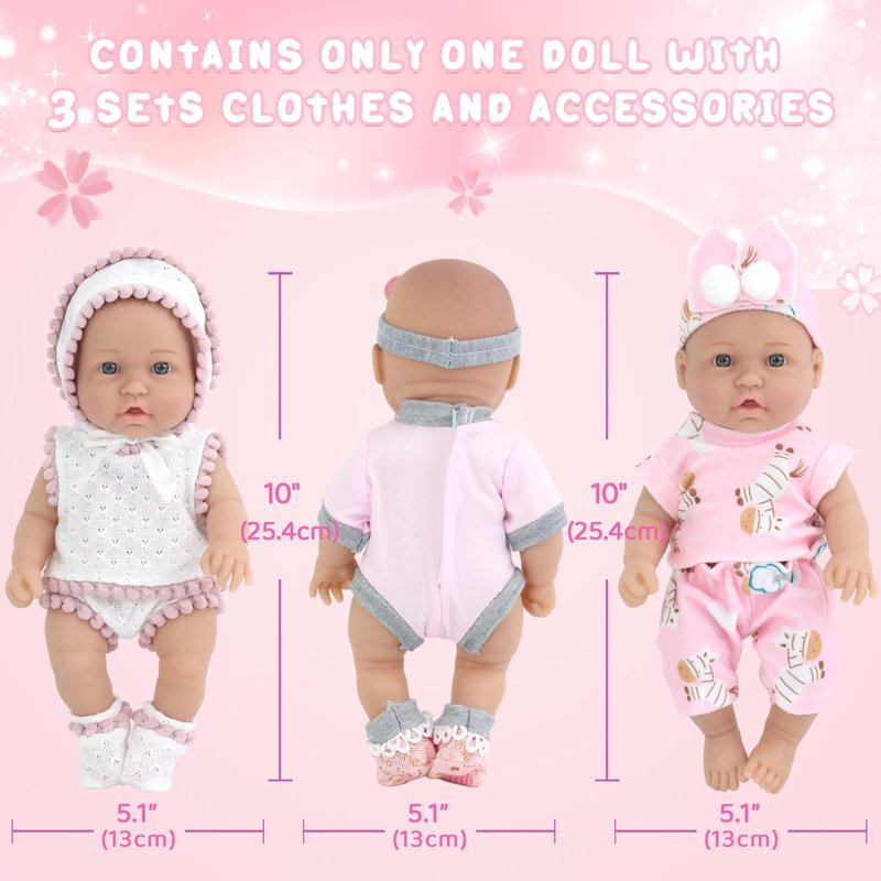 10 Inch Baby Doll with Doll Clothes and Accessories Set, Gift Set with 10" Realistic Baby Doll, 3 Sets of Clothes, Bottle, Pacifier, Rattle & Accessories Ages 3+