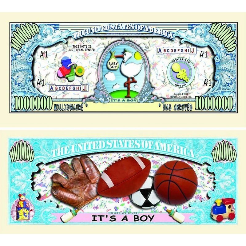 10 It's A Boy Million Dollar Baby Bills with Bonus “Thanks a Million” Gift Card Set