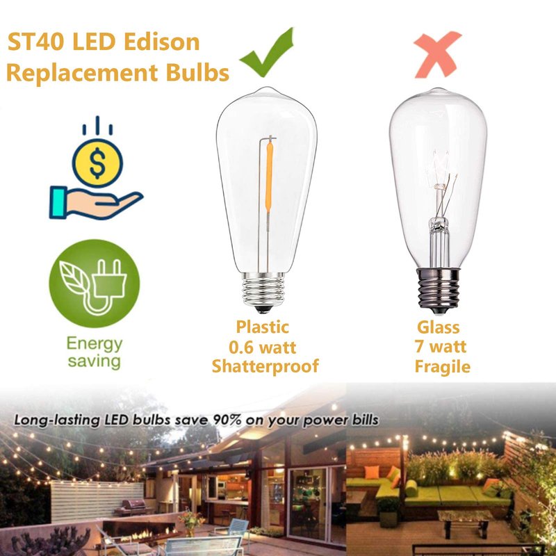- Energy-saving LED light bulbs, long lifespan for usage. For ST40 incandescent edison string lights, please search "B07BLPCZDP".