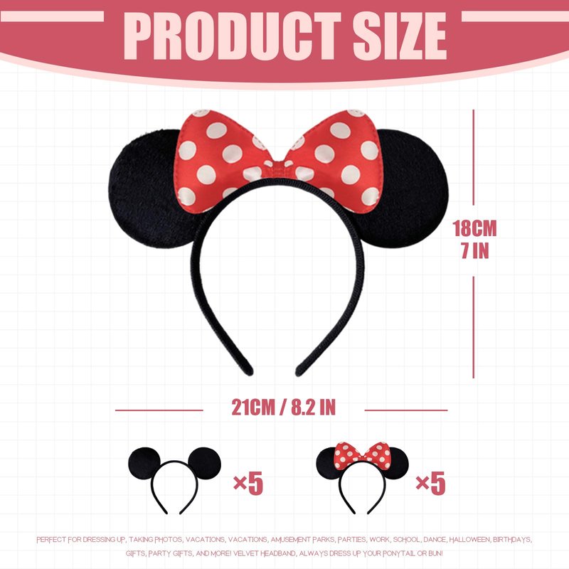 - Great Value: 10 pcs Mouse Ears Headbands in 2 style (5 ears blackfor boys and 5 ears with Pink bow for girls )The set of 10 Mouse ears party supplies are the must-have items for anyone who wants to have themed party.
