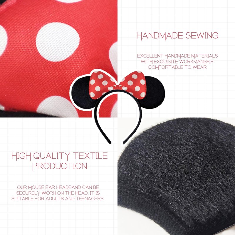MATERIAL:Made of soft, felt-like fabric while the ears have a cute red dotted bow. With the size of 8.7 x 7.1 x 0.6 inches, this mouse ears headband fits for adults' head as well as toddlers