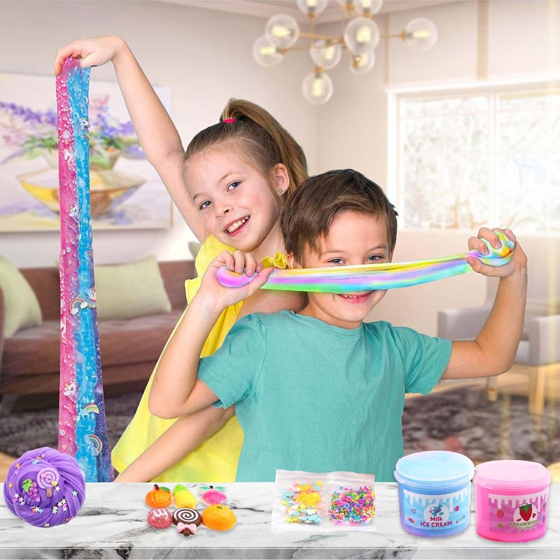Slime kits are crafted to be super soft, stretchy, and pokeable, non-sticky, and tear-resistant, making them easy to clean and play with.