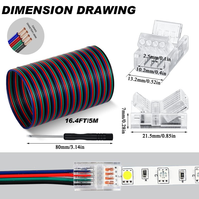 - Meet You Daily Needs: you will receive 1 piece of 16.4 feet LED strip extension cable, 10 packs of transparent LED strip connectors and 1 screwdriver that can be applied to open the LED connector, which are complete and useful tools in your daily life, enough to satisfy connection needs