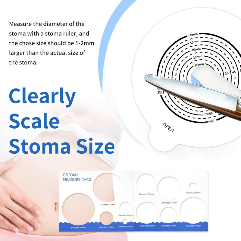 - ✔CUT TO FIT : Our colonoscopy bags with cut to fit barrier which apply to the stoma sizes from 0.8inch (20mm) to 2.36 inches (60mm). You can use the stoma aperture measurement board in package to measure your stoma.