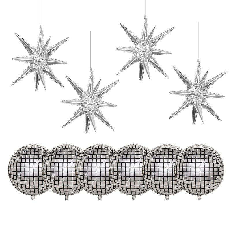 10 Pcs Disco Ball Balloons 6 Pcs Disco Party Balloons 4 Pcs Star Balloons 22 Inches Silver Disco Ball Balloons Metallic 4D Foil Silver Balloons for 70s 80s 90s Disco Party Supplies Decorations