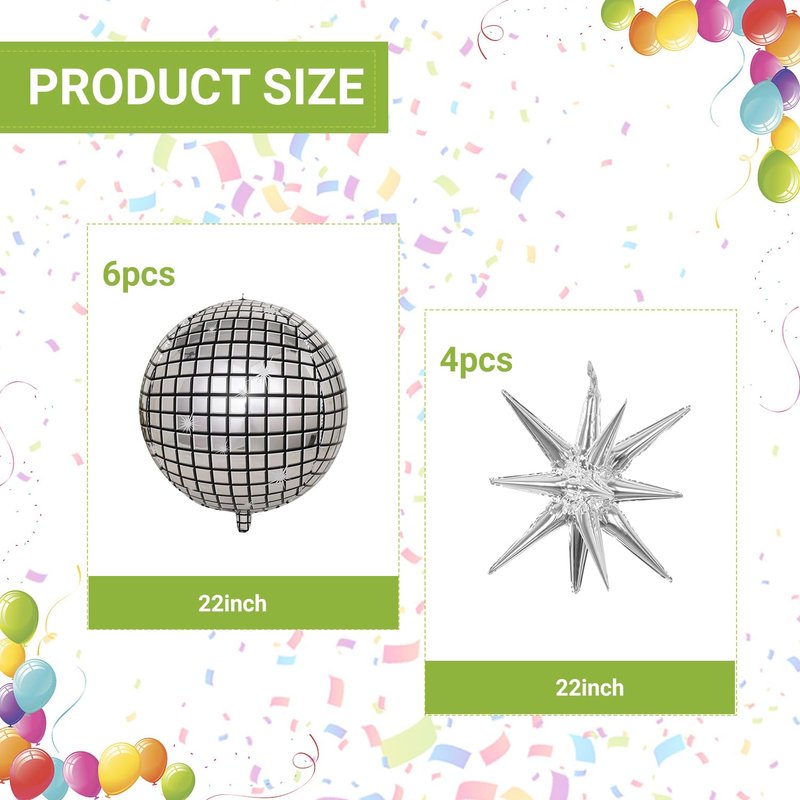 - 【Package Includes】You will receive 6pcs Disco Ball Balloons and 4pcs 22inch exploding star balloons. This balloon doesn't need to be assembled, it is simpler to use, It is fully automatic sealing, and It can last for several weeks after being inflated, enough quantity to meet your needs for balloons at various theme parties.