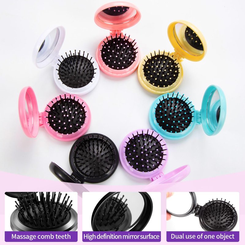 10 Pcs Folding Pocket Hair Brush with Mirror and Round Mini Comb for Travel (5 Colors) - Unisex
