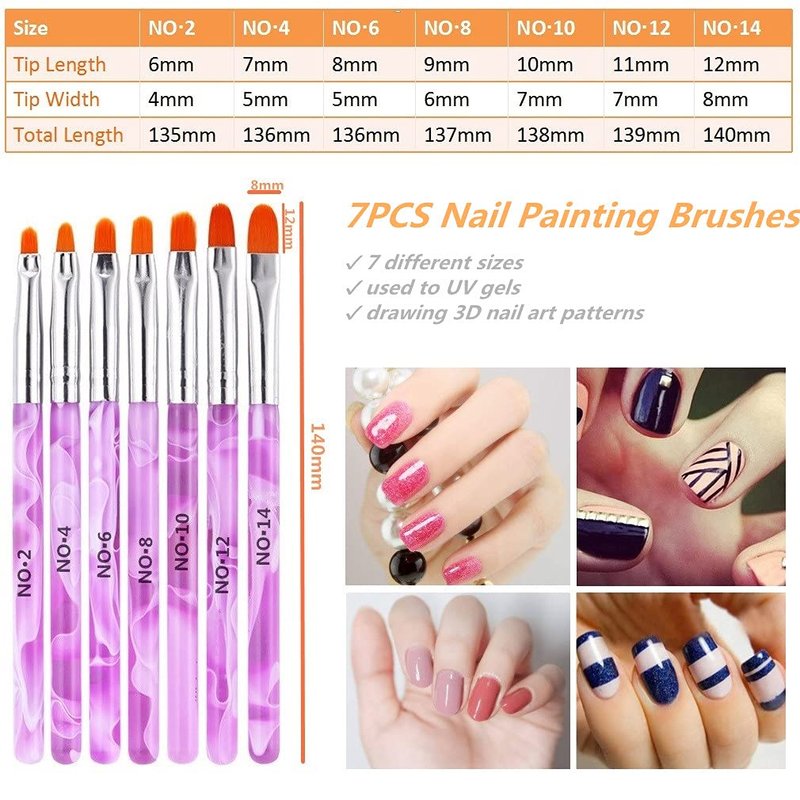 - 【7Pcs/Set Nail Art Brush Kits】 7PCS UV Gel acrylic nail art brushes in 7 different sizes: No. 2 / 4 / 6 / 8 / 10 / 12 / 14. Made of Acrylic material and quality fiber. The UV gel nail brush is durable and non-deformation, non-corroding. Safe and easy for use. UV Gel Acrylic Nail Brushes used for UV nails and french nails. Nail powder and flakes can be picked by these brushes. You can draw any beautiful painting or 3D painting as you like.