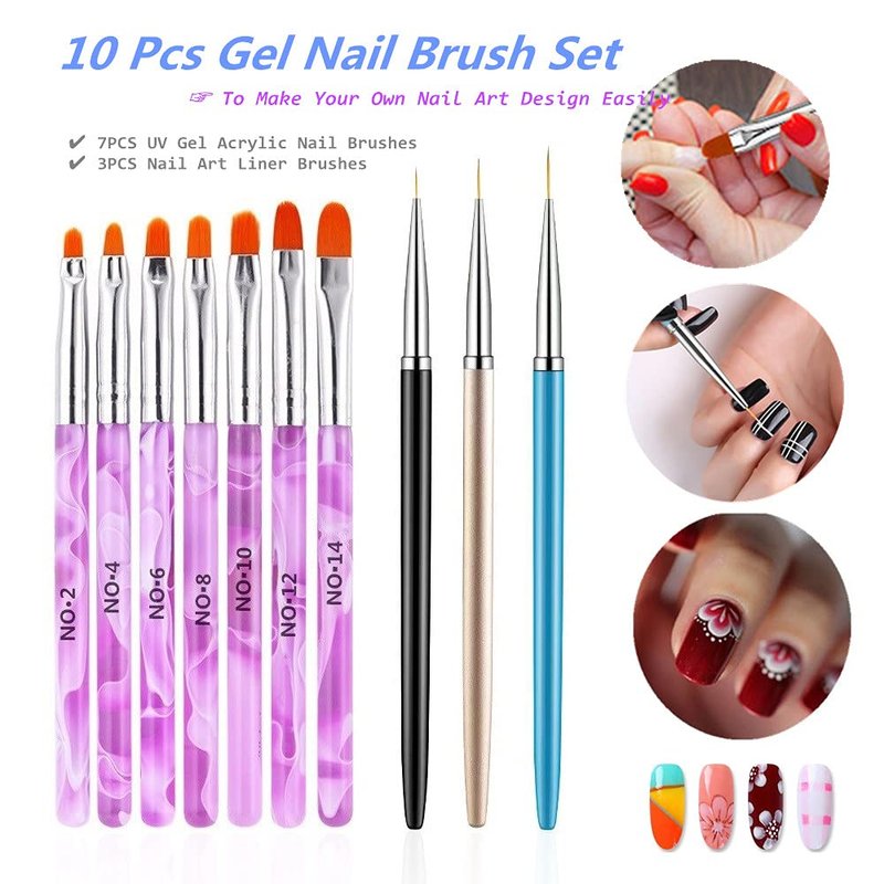 10PCS Gel Nail Brush Set : 7PCS UV Gel acrylic nail art brushes & 3PCS Nail Painting Brushes Features: 7 Pieces UV Gel nail acrylic brushes come with 7 different sizes, that can be used to build up your UV gel or acrylic nail false tips on different occasions. Special designed for finest detailing tasks like painting leaves and flower petals Convenient to take, could DIY for your nail with different designs by this item, help to create your personal character 3 Pieces of nail brushes in different lengths are included, meeting your basic needs for creating nail arts. The bristles are nice so they hold polish well and you don't have to keep dipping your brush. Ideal for drawing lines & fine drawing on nail tips. Perfect for doing acrylic nails, suitable for nail gel applying and so on. Great brushes for beginners, making application so much easier. Suitable for professional use or home use. Specifications: - 7PCS UV Gel Acrylic Nail Art Brushes Material: Acrylic & Fiber 7 sizes: No. 2 / 4 / 6 / 8 / 10 / 12 / 14 Pen Length: approx. 13.5cm - 3PCS Nail Painting Brushes Material: Metal & Nylon Color: Black, Blue and Gold Pen Length: Approx 14.7cm / 5.78inches Brush Length: 7mm/0.28", 9mm/0.35", 11mm/0.43" (Approx.) Package Includes: 7 x UV Gel Acrylic Nail Art Brushes 3 x Nail Art Liner Brushes