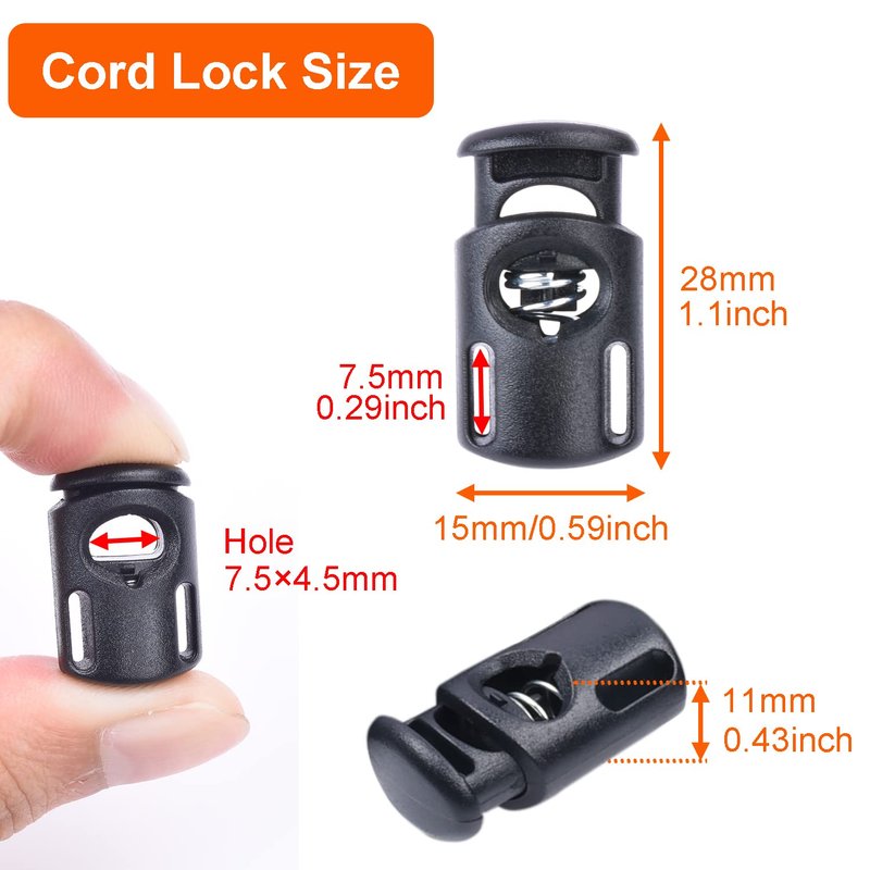 - 【Parcord Cord Lock Szie】10 Pack Single Hole Cord Lock Stopper for Drawstring, Outter Size: 28 x 15mm,Hole Dia. 7.5 x 4.5mm,Color: Black. Please pay attention to the size of the product image so that the size is not appropriate, Cord Lock does not include ropes !