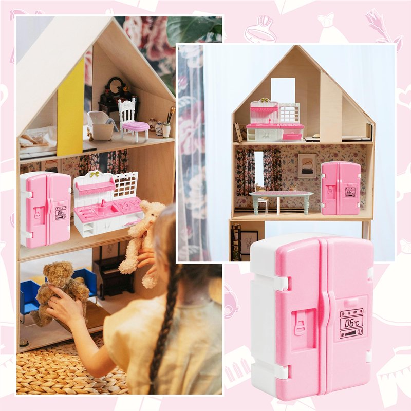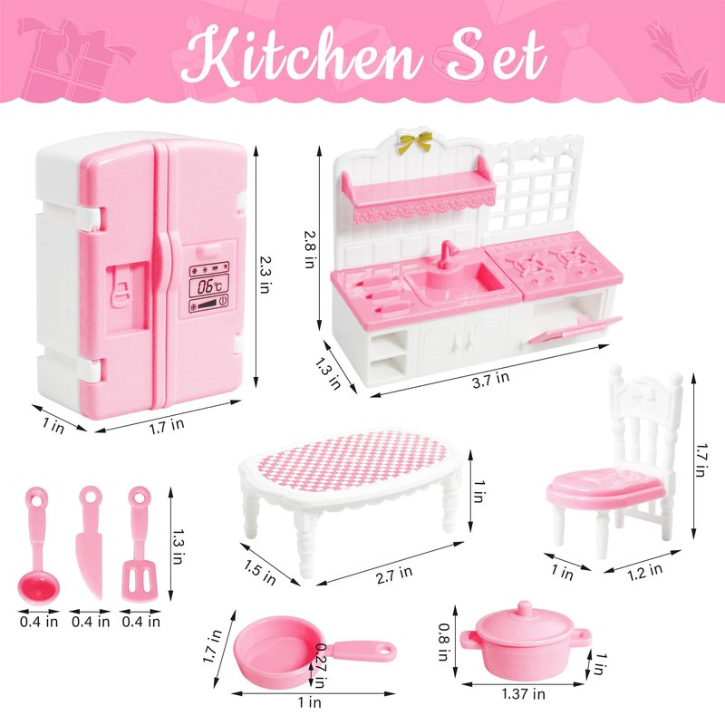 - 【Cute Addition to Dollhouse】 These miniature kitchen furniture and accessories are very sturdy, well made, with pretty pink color. The size is perfect for small hands and could fit in any doll house and play house. No assembly required, so it will be a great gift for children who love playing with dolls on birthday, Christmas and other festivals.