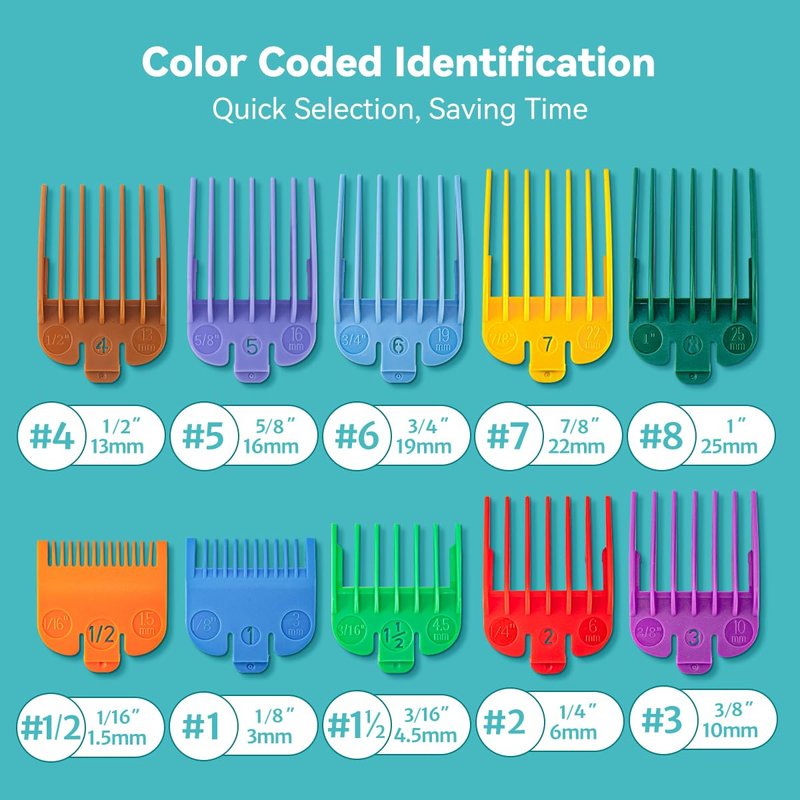 - Color Coded: Each guard features a unique color and cutting length for quick identification.
