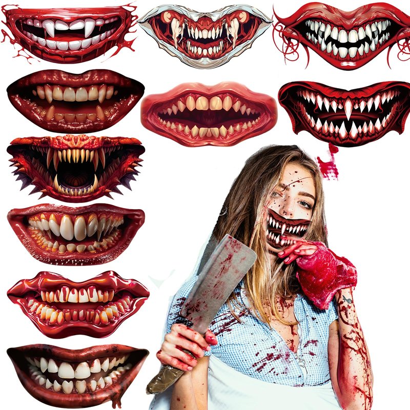 Scary Big Mouth Tattoo Stickers for Halloween, Zombie Skeleton Clown Makeup, Horror Face Decals, Cosplay and Costume Accessories