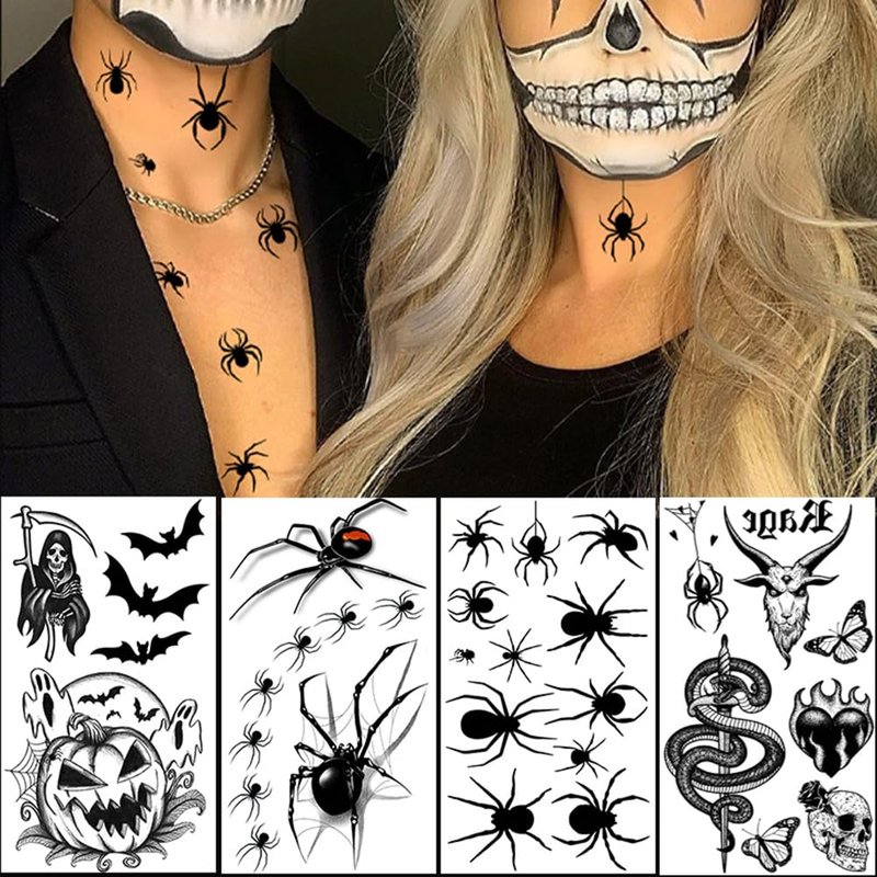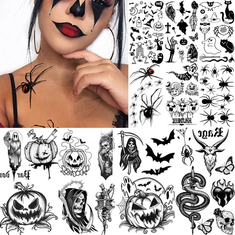 - [ Halloween Elements ] The water transfer fake tattoos have different pattern designs related to Halloween, including skulls, skeleton, ghosts, bats, evil pumpkins, spiders, snakes and more realistic and vivid patterns. Perfect party favor supplies for Halloween costumes and Day of The Dead.