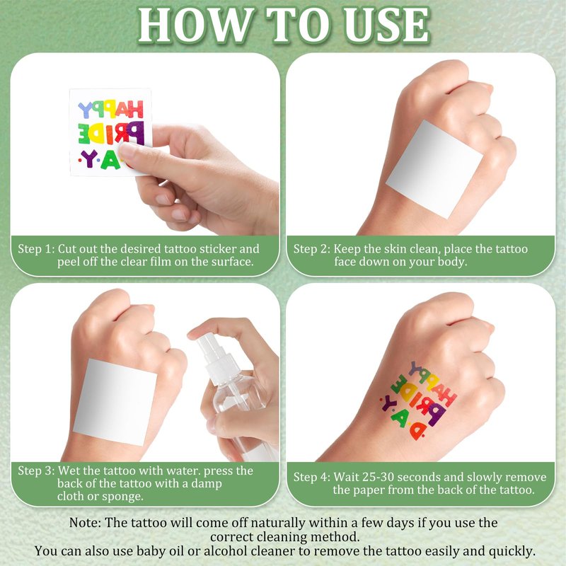 - EASY TO USE: Easy to use temporary tattoo, cut out the target gay pride tattoos, wipe the skin clean, tattoo design face down on the skin, then cover with a wet sponge for 20-30 seconds, remove the backing paper and you'll have a perfect pride temporary tattoos! Remove the convenient pride stickers tattoos, using makeup remover, lotion, baby oil, olive oil or alcohol will be able to easily remove pride temporary tattoos. Easy to carry and can be shared with friends at concerts or parties, gay pride celebrations.