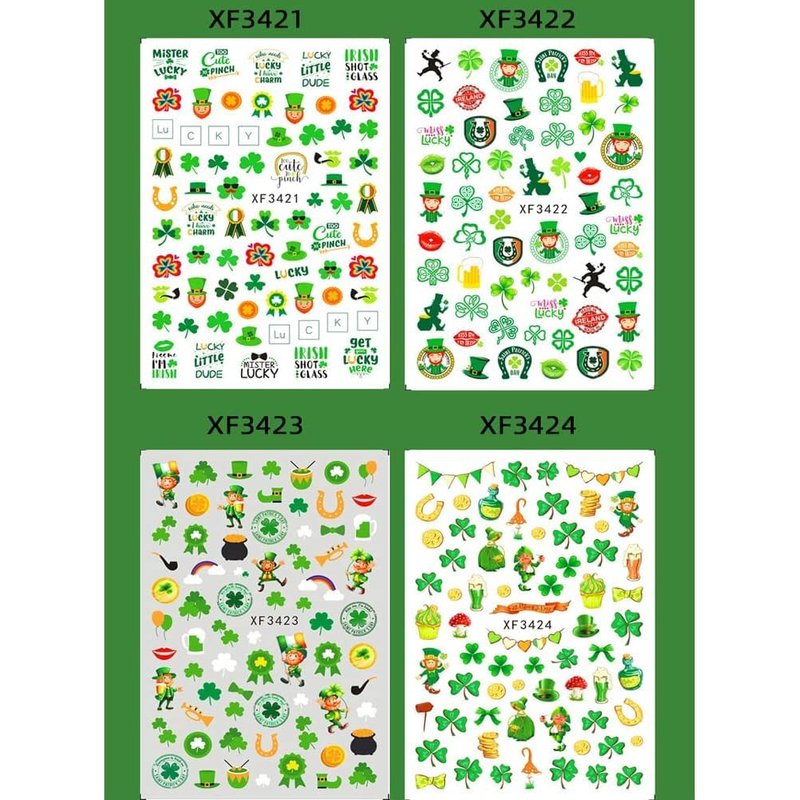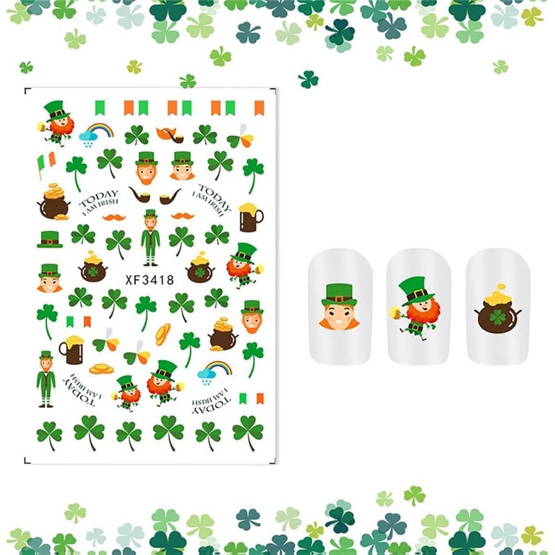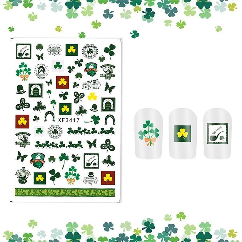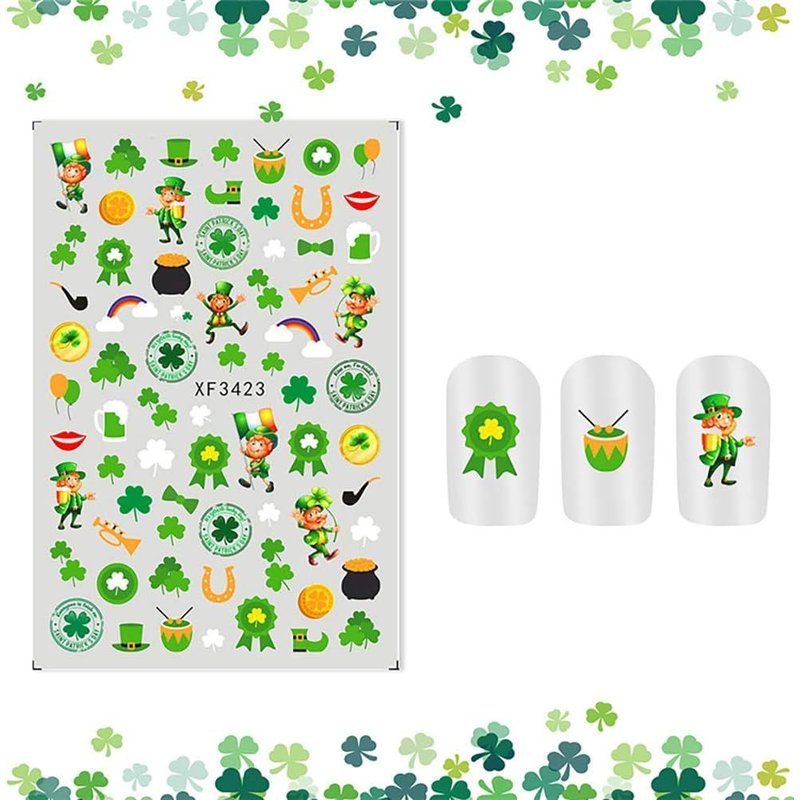 - St. Patrick’s Nail Design: This is a St. Patrick's Day nail sticker kit with 10 nail stickers in different designs. It includes typical St. Patrick's Day elements, shamrocks, mister lucky, little dude ,beer, gold jars, goblins, Irish flags, goblins, hats and more.