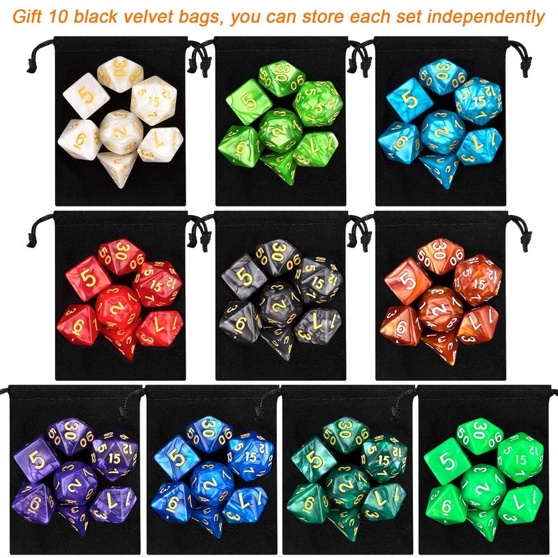 10 X 7 Polyhedral Dice Set (70 Pieces) for Dungeons and Dragons DND RPG MTG Table Games D4 D6 D8 D10 D% D12 D20 with 10 Pack Black Bags, 10 Colors