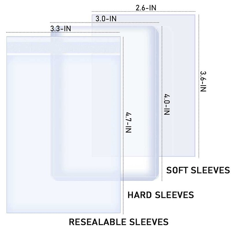 - PACKAGE INCLUDED:One Package Include 100 Thick Card Sleeves (3 x 4 inch), 100 soft card sleeves (2.6 x 3.58 inch), 100 resealable sleeves (3.3 x 4.7 inch). Triple sleeves to protect your trading card.