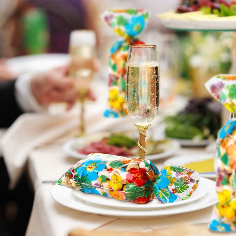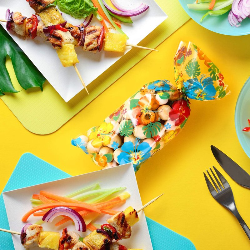 Designs pattern: different flying summer flowers, so adorable hibiscus cellophane bag for hibiscus party, luau dinner, beach lunch, summer picnic