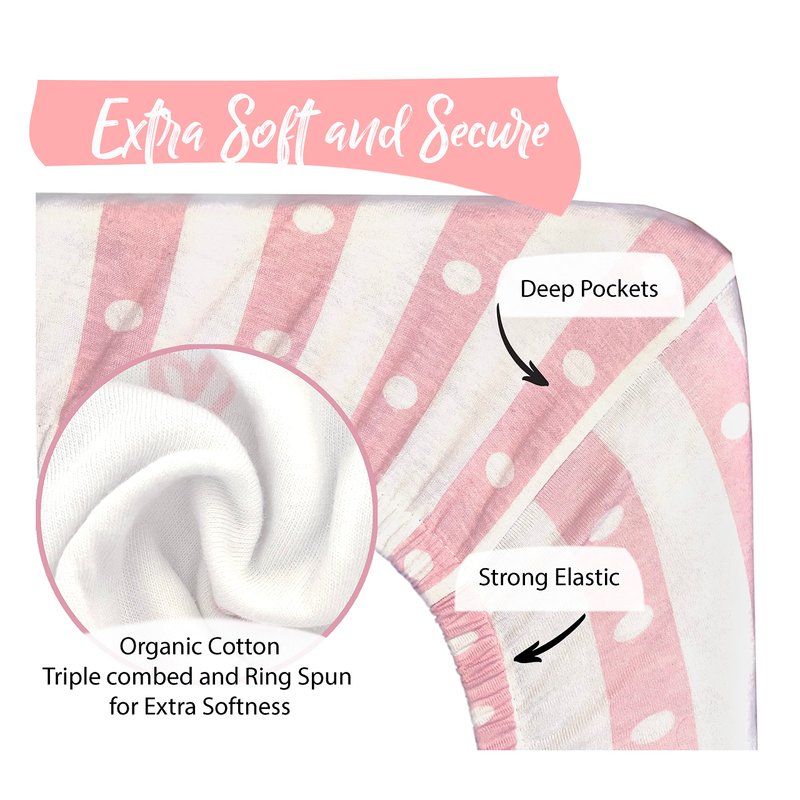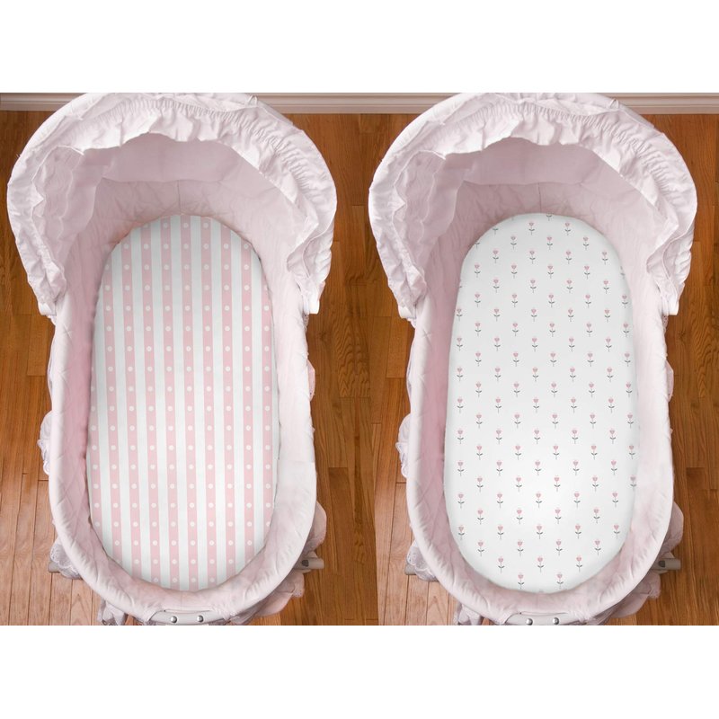 100% ORGANIC COTTON BASSINET SHEETS. These jersey bassinet sheets are sized to fit oval, hourglass and rectangular bassinets up to 18” wide. They have strong elastic for a secure fit. GOTS CERTIFIED ORGANIC COTTON. Cambria Baby adheres to the internationally recognized Global Organic Textile Standard. GOTS License No GCL-4GO300285). The fabric is woven to a soft jersey, which is heavenly soft for your baby’s comfort. ADORABLE DESIGNS. The heart, stripe and tulip patterns will enhance any girl's nursery. A 3-pack ensures you’ll always have an extra one on hand. DURABLE AND EASY TO CARE FOR. 100% organic cotton is woven into a soft jersey, and is then pre-shrunk to be conveniently machine washable.
