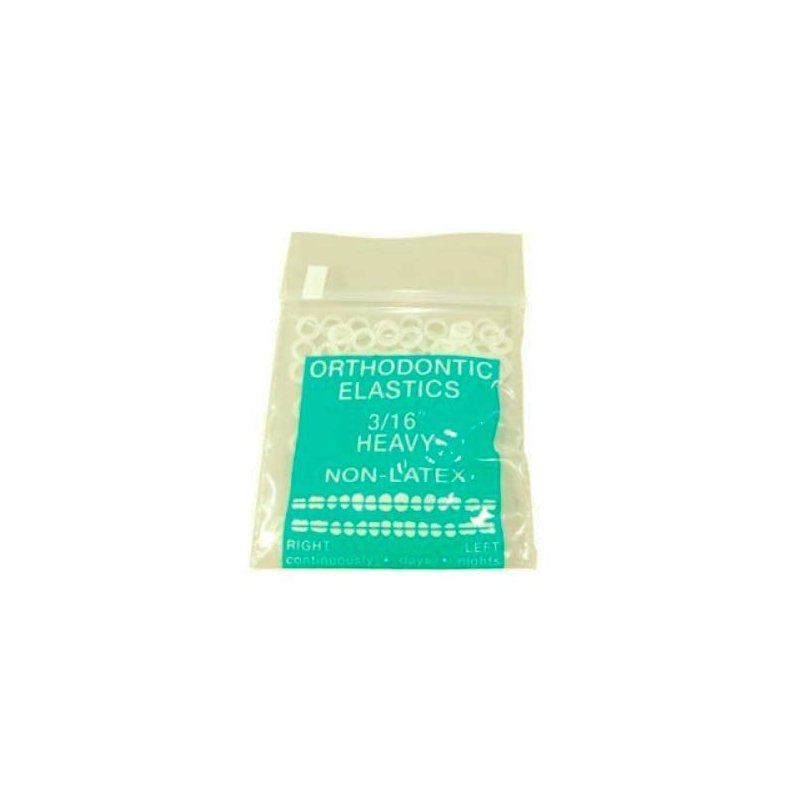 Clear - Dental/Orthodontic Elastic Rubber Bands. You will receive 1 Pack (100 elastics per pack) Size: 3/16" Heavy - 4.5 oz. Manufactured from prime medical grade material, these elastics are the highest quality elastic on the market. Every package is checked to assure all cuts are consistent and that the forces are correct. Brand New Manufactured in the USA Other uses for orthodontic elastic: dog grooming elastics, doll hair elastics, cornrow rubber bands, fishing rod building guides blanks, small rubber bands for crafts, model airplane rubber bands, small elastics for packaging purposes.
