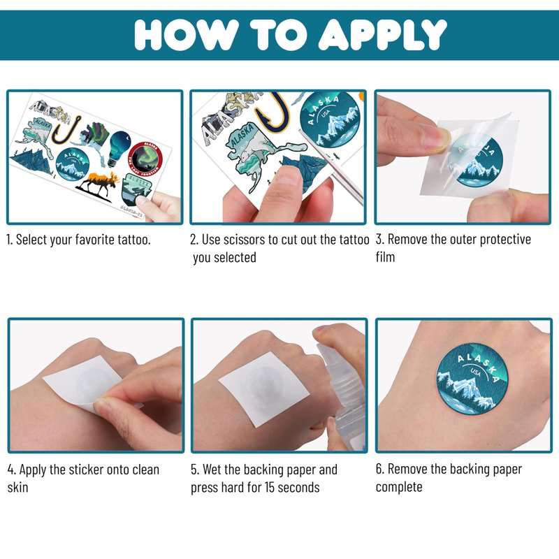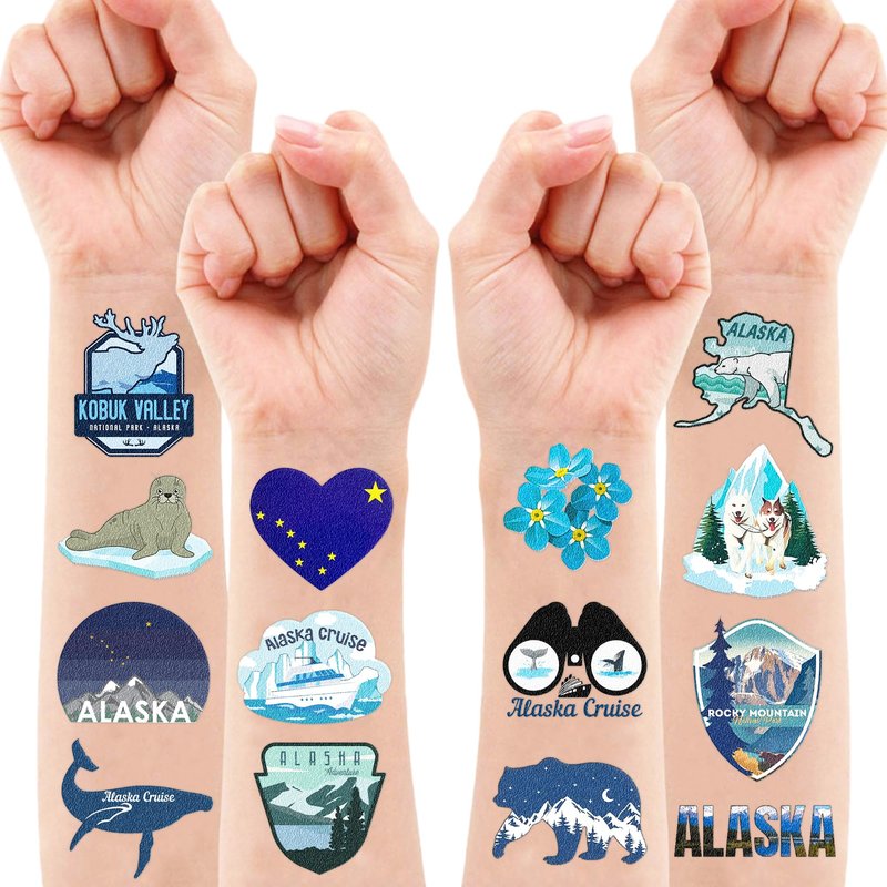 - 🏞️ALASKA CRUISE: Hi everyone! An amazing set of 10 sheets including 100 a size of 6.1 by 3.1 inches. These ALASKA tattoo pieces will be sent to you quickly, place your order to get these temporary tattoos.
