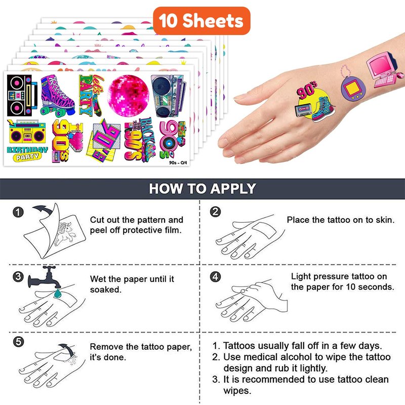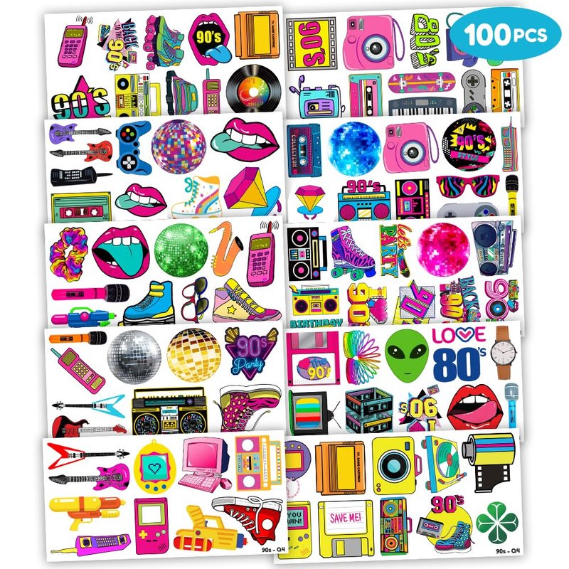 - Cute Back To The 90s 80s Retro 1990s 2000s 1980s Birthday Party Supplies: 10 sheets 90s 80s 90’s 80’s 00s Hip Hop theme temporary tattoos stickers, features an assortment of cute themed characters, each sheet measures 6.1 x 3.1 inch , all kinds of designs and colors will bring more fun to your party, one size fit all adult and kids.