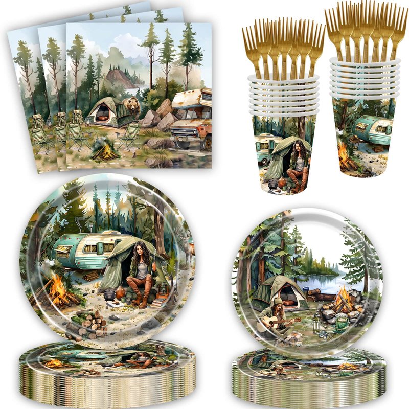 100 Pcs Camping Bachelorette Decorations Outdoor Adventure Disposable Paper Dinner Plates Napkins Cups Forks Dinnerware for Camping Girls Bridal Shower Wedding Engagement Party Decorations Supplies