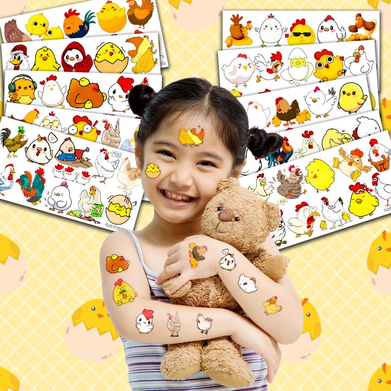 - 🐔CHICKEN PARTY DECORATIONS: Hi everyone! An amazing set of 10 sheets including 100 a size of 6.1 by 3.1 inches. These CHICKEN tattoo pieces will be sent to you quickly, place your order to get these temporary tattoos.