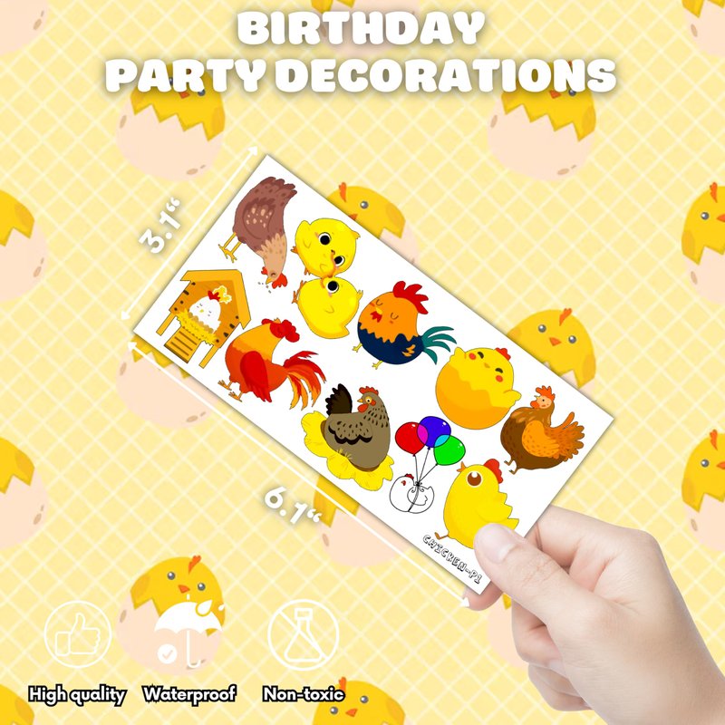 - 🐣CHICKEN BIRTHDAY PARTY:Elevate the excitement level of your celebration with our collection of temporary tattoos inspired by chickens farm. We offer a range of unique styles that will add an extra flair to your event. So don't settle for an ordinary gathering, get our chicken tattoos now and make your event unforgettable!