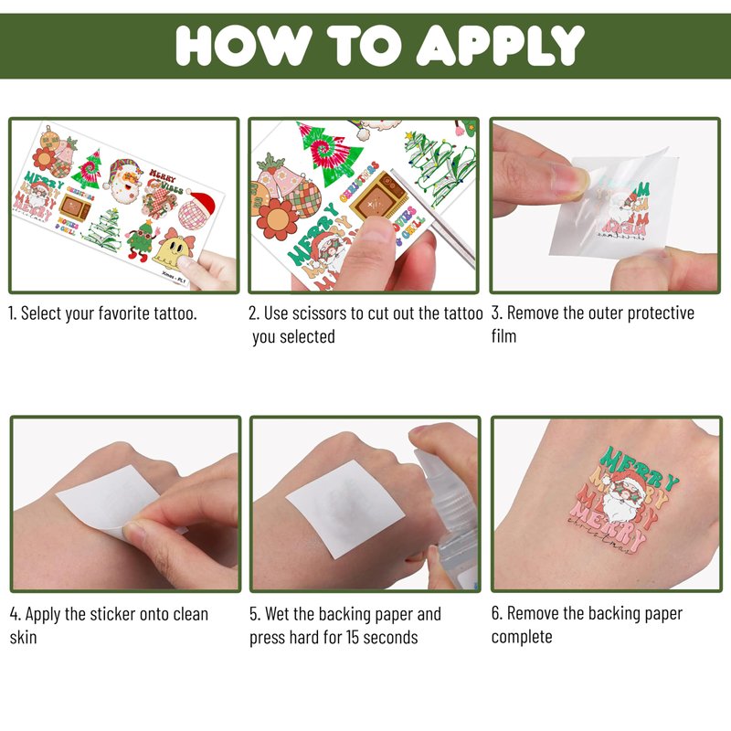 - Pattern rich: Christmas Groovy Retro Boho Hippie Noel Xmas Winter Temporary Tattoos include Ten Sheets One Hundred PCS, the size of each sheet is Six point One * Three point One inches. Easy to share,even if a lot of people's parties, you can have a different tattoo with others.These adorable tattoos will keep you and your little ones – and their friends – occupied for a while.