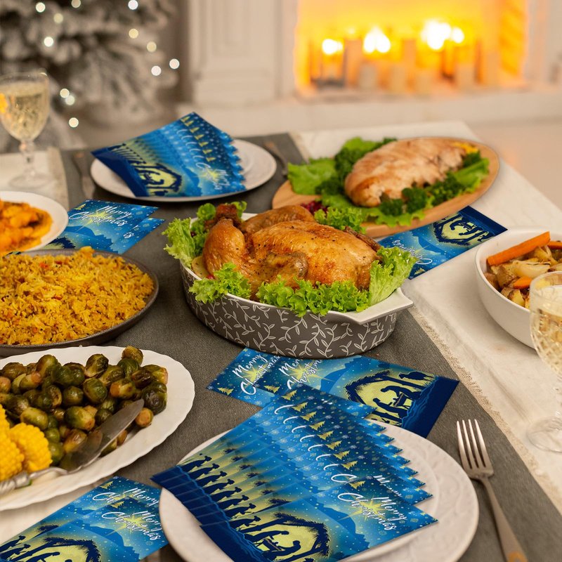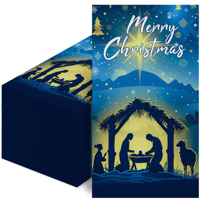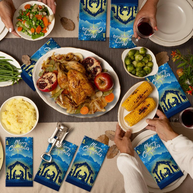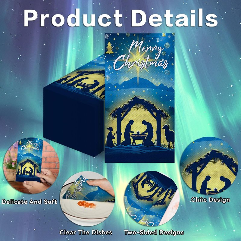 - Elegant Christmas Themes to Impress Your Guests: Experience the magic of Christmas with our exquisitely designed nativity scene napkins. Each one features a stunning print of Jesus' birth, adorned with golden light and twinkling stars, along with the heartwarming message Merry Christmas.These christmas nativity napkins not only add elegance to your table but also convey your best wishes to the world. They're sure to captivate your guests and create unforgettable memories.