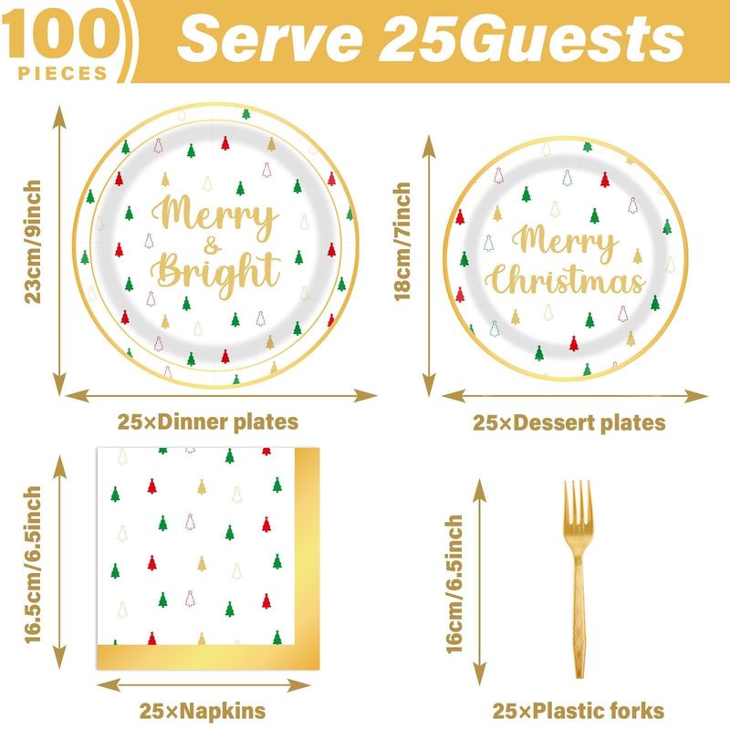 - 【Package Includes】You will receive 25 pieces of Merry Christmas party paper dinner plates of 9’’,25 pieces Christmas Guest Disposable paper plates of 7’’,25 pieces of Xmas napkins of 6.5’’ and 24 plastic forks for each set that can enough to satisfy 25 guests.