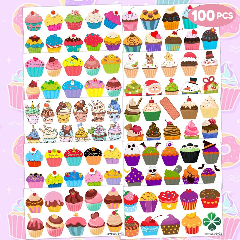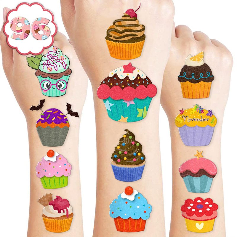 100 PCS Cupcake Temporary Tattoos Birthday Party Decorations Supplies Favors Sweet Tea Cupcake Dessert Candy Decor Tattoo Stickers Gifts For Game Boys Girls Classroom School Prizes Reward