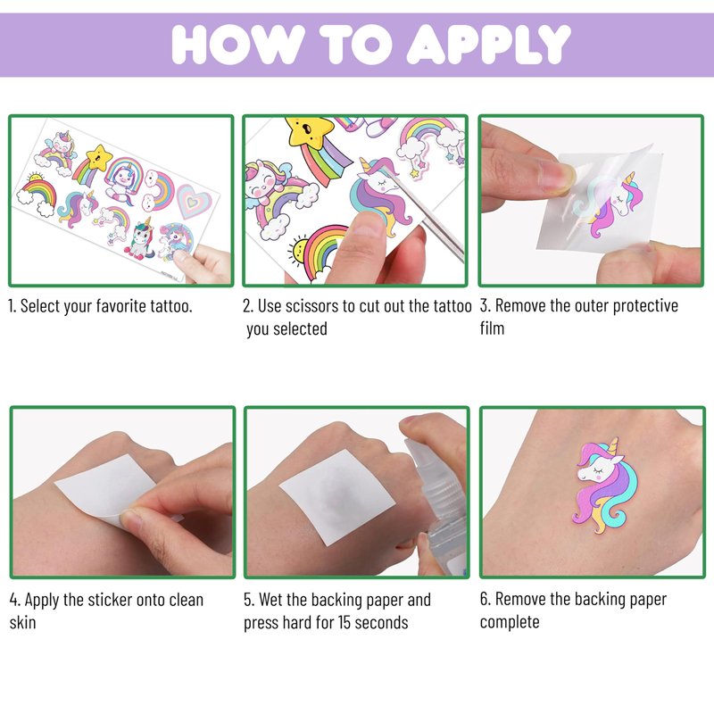 ππ¦ TATTOOS FOR UNICORN RAINBOW THEMED DECORATION: UNICORN RAINBOW TATTOOS for people who love UNICORN, rainbow, color pastel, pastel rainbow . Featuring 10 sheets with 108 pcs of lovely, fun and colorful design. Each sheet measures 6.1 * 3.1 inches. You can temporarily tattoo them on your body or objects such as phones, bottles, laptopβ¦ ππ¦ FUN GIFT FOR UNICORN RAINBOW BIRTHDAY PARTY DECORATIONS SUPPLIES: UNICORN RAINBOW TATTOOS for themed party, outdoor parties, birthday parties, school rewards and other party events. UNICORN RAINBOW TATTOOS are also interesting and lovely gifts for your children. Complement your unique collection with a UNICORN rainbow tattoo! ππ¦ SAFE AND HIGH QUALITY: We use safe, high-quality to create durable and long-lasting tattoos. These are non-toxic materials, ensuring safety for all skin types. This product is not recommended for individuals with sensitive skin. We advise testing the product on a small patch of skin, such as the hand, to check for any allergic reactions to the ingredients before applying it to other areas of the body. ππ¦ EASY TO USE AND REMOVE : You can place them on your hands, arms, face, or any comfortable area. Simply cut out each tattoo from the sheets and remove the clear protective layer. Wet the tattoo thoroughly with water, wait for 20-30 seconds, and then remove the backing paper. The result will be a velvety, long-lasting tattoo. ππ¦ SERVICE COMMITTED CUSTOMER: We are committed to providing a positive experience for our customers and do our best to resolve any problems. If you encounter any issues with our product, please don't hesitate to contact us.