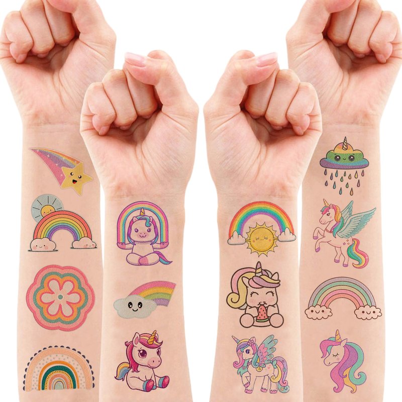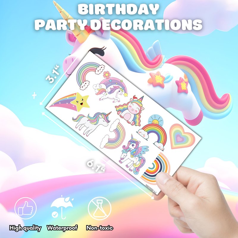 - ππ¦ FUN GIFT FOR UNICORN RAINBOW BIRTHDAY PARTY DECORATIONS SUPPLIES: UNICORN RAINBOW TATTOOS for themed party, outdoor parties, birthday parties, school rewards and other party events. UNICORN RAINBOW TATTOOS are also interesting and lovely gifts for your children. Complement your unique collection with a UNICORN rainbow tattoo!